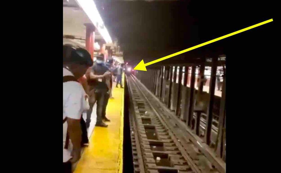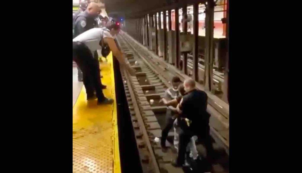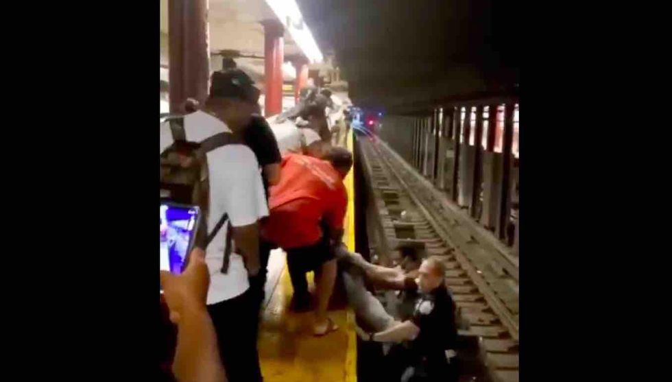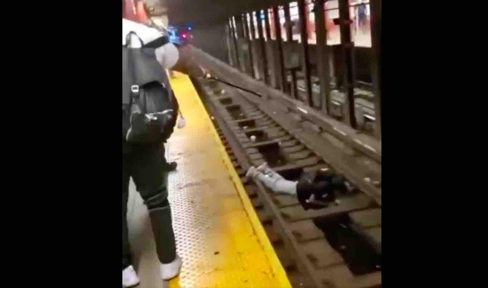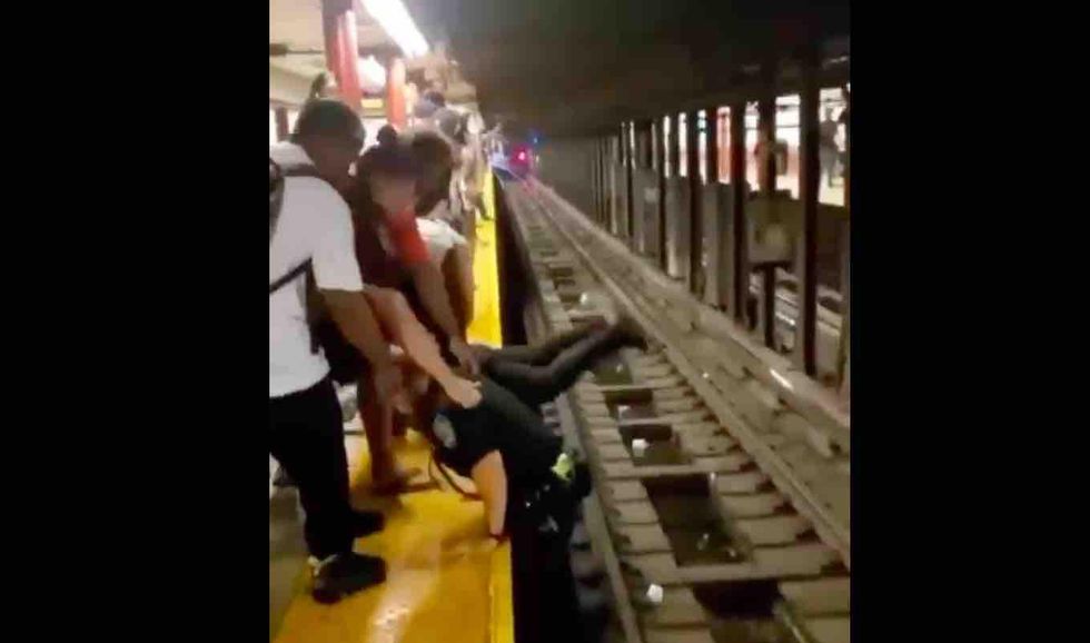 Waiting passengers helped pull all three of them to safety, hollering for them to hurry up, as a voice on a speaker warned folks to move back in preparation for an oncoming train: