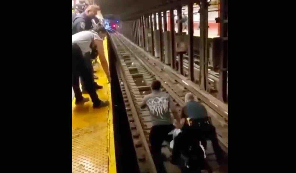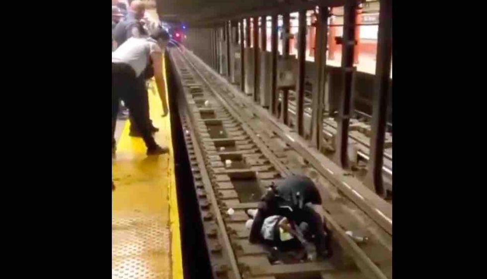 Soon one of the bystanders took a risk of his own and jumped down to join the officer in an attempt to get the man off the tracks: