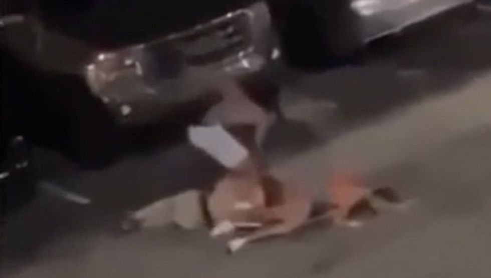A male was caught on video brutally body-slamming a female on a parking lot surface in Auburn, Alabama, over the weekend after she tried to end her attacker's beatdown of another male.