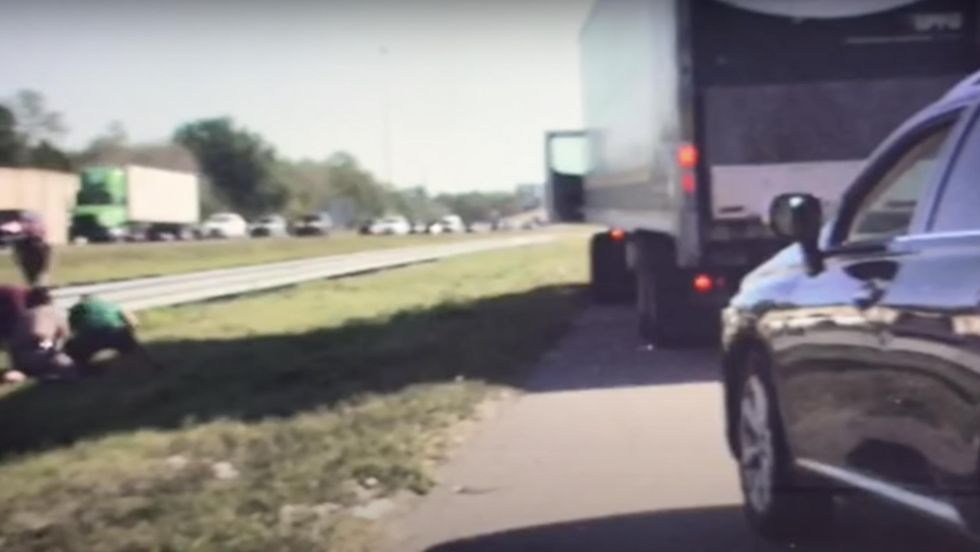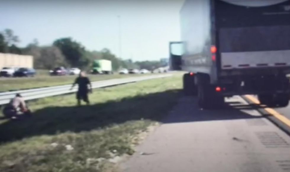 But soon a truck driver pulled over, ran toward the scuffle, and helped subdue Delgado so the trooper could handcuff him.