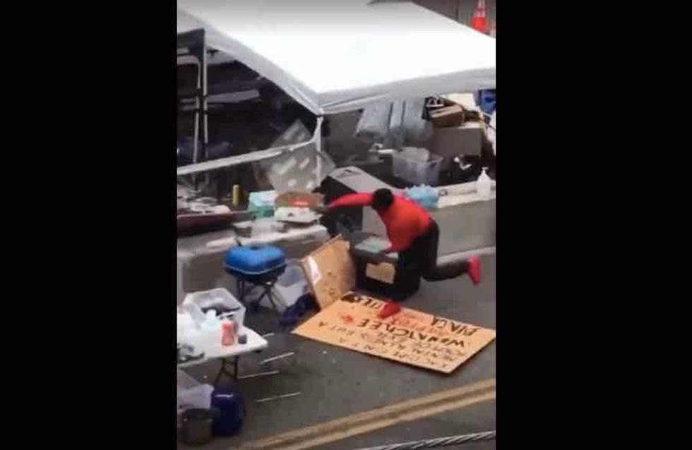 As he tossed more barricades, the fed-up man declared, "I'm sick of this s**t! F*** all you guys! Go home!"