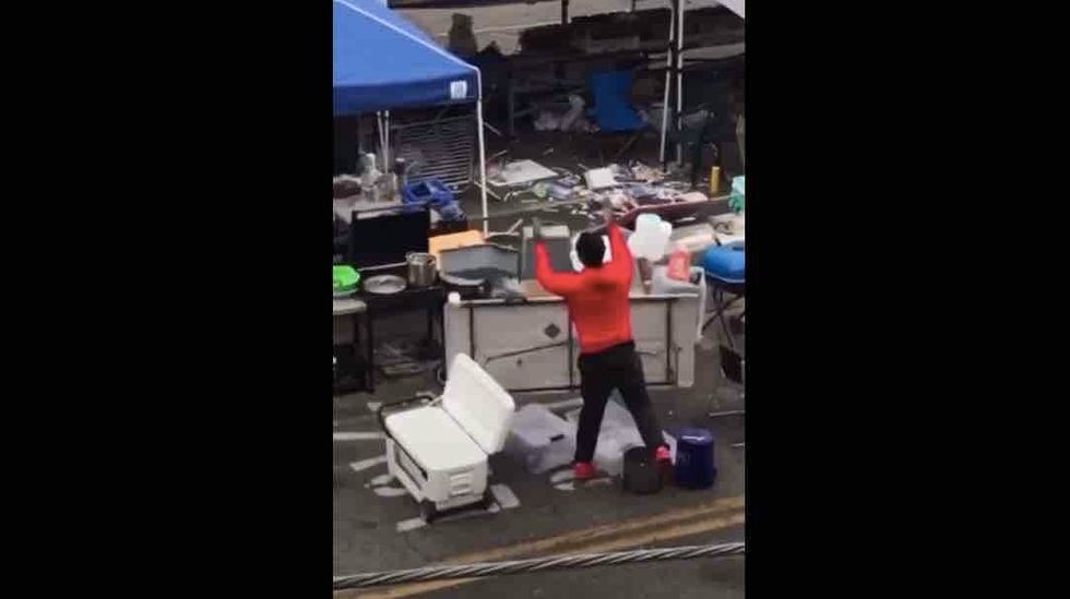 Oh, but that was just a warm up: Seconds later the fed-up man began turning over tables, scattering odds and ends all over the street, before walking away in disgust.