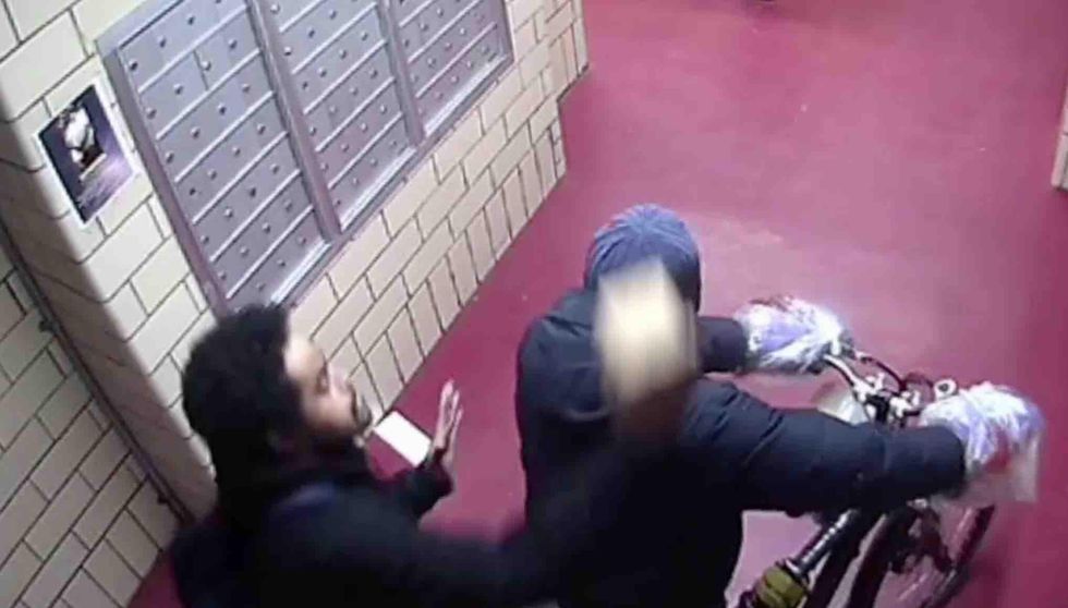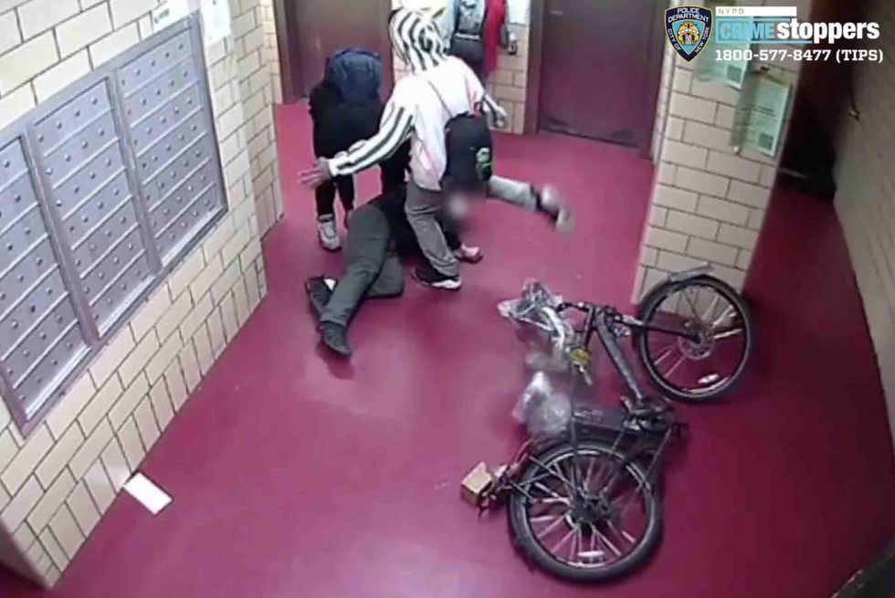 The man had been walking his bicycle toward the elevators before the attack commenced in the apartment building on East 165th Street near Tinton Avenue; once the victim was helplessly on the ground, another mugger joined his accomplice and kicked the man in the face.