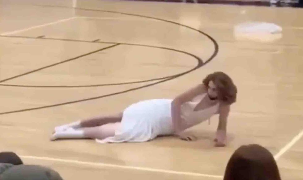 In the clip, the male student in the white gown imitates Madonna's infamous live rendition of "Like a Virgin" in which the legendary singer writhed onstage in sexually suggestive ways.