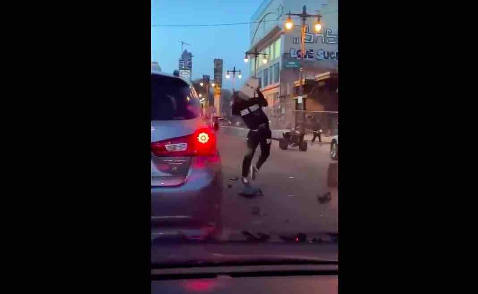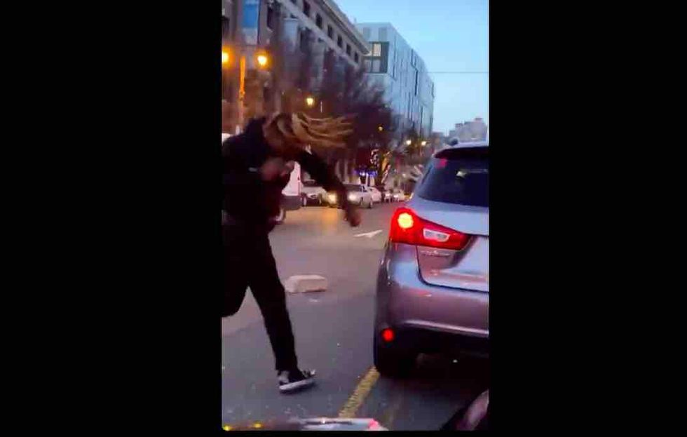 Another clip shows the rider picking up what appeared to be heavy debris from the street and chucking it at both sides of the SUV, and the vehicle's windows appear to shatter: