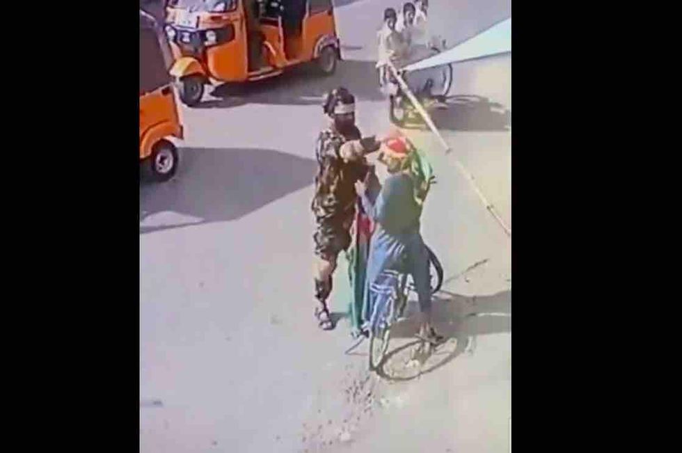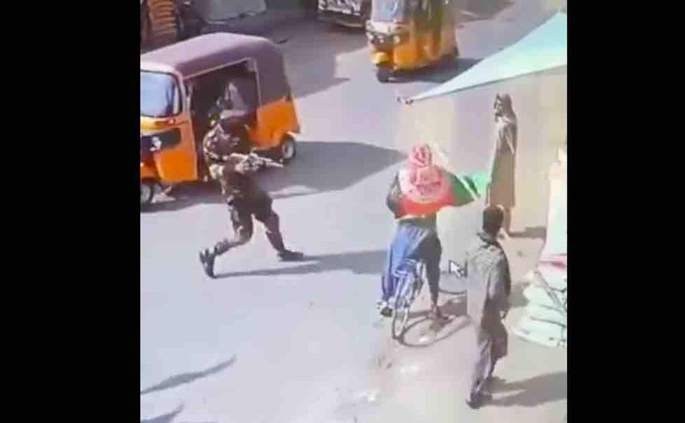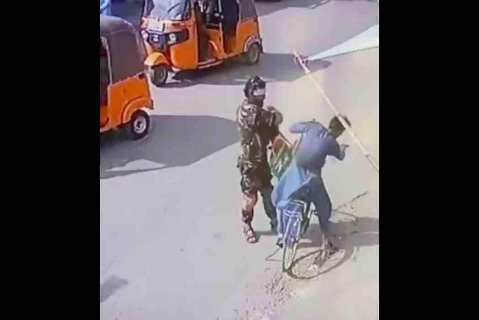 A cellphone video posted to Twitter on Thursday appeared to show a rifle-wielding Taliban militant jumping out of a pickup truck bed packed with his comrades in arms to confront a man riding a bicycle in the opposite direction.