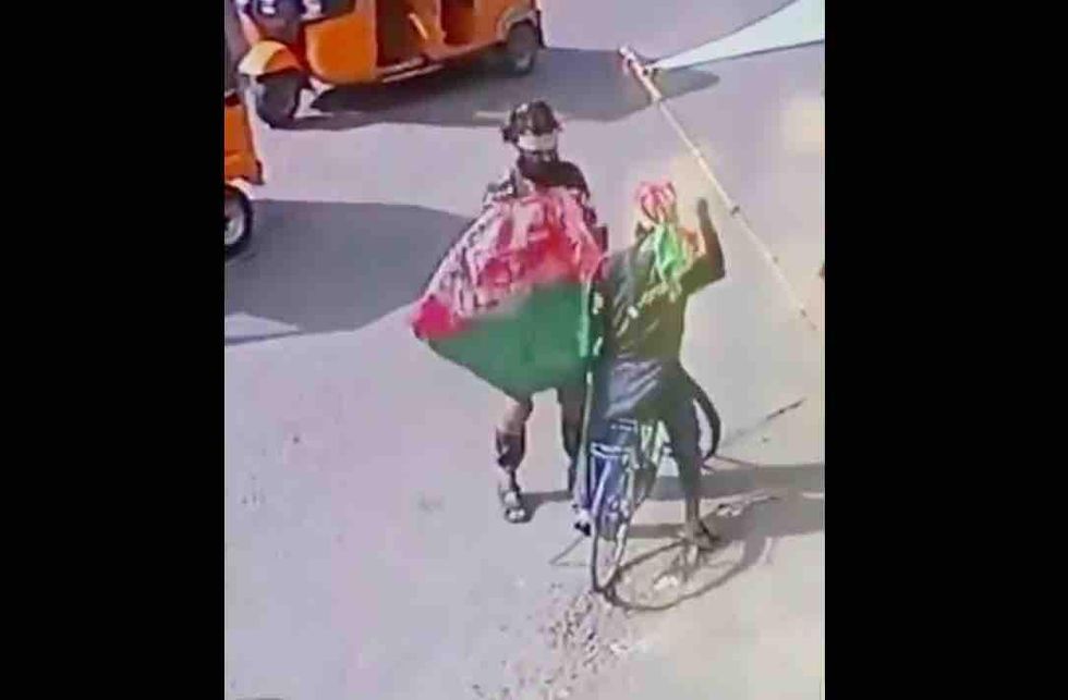 The militant apparently had one thing on his mind: The flags of Afghanistan that the bicyclist was wearing as a cape and a head covering.
