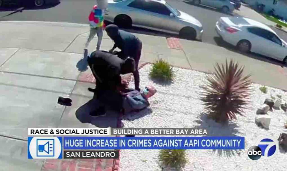 A pair of teenagers were caught on surveillance video knocking down an 80-year-old Asian man in a northern California neighborhood Saturday before punching him, slapping him, and robbing him — all amid high-pitched giggles presumably from a third teen as the victim cried out for help, KGO-TV reported.