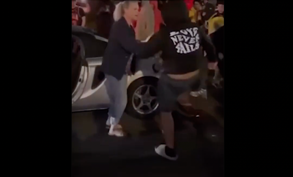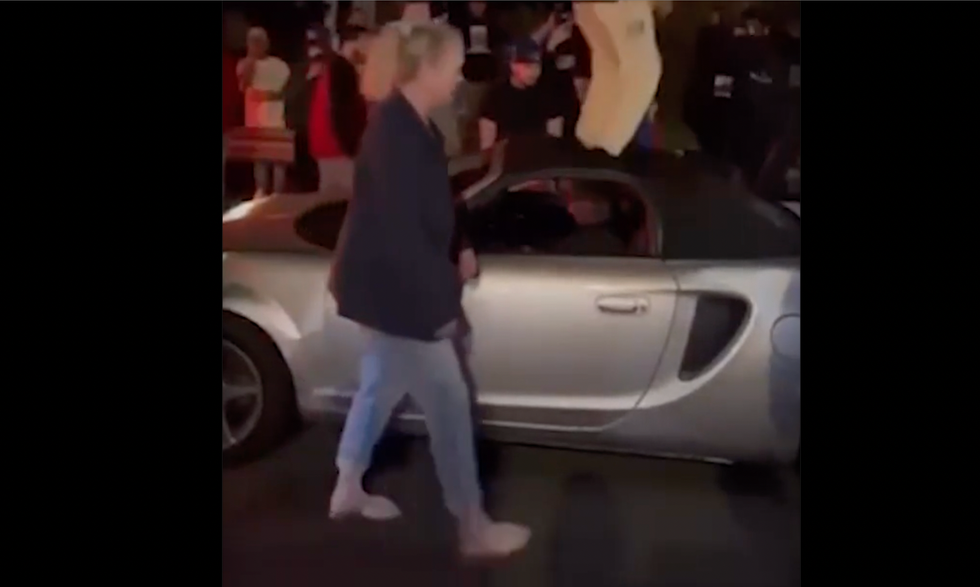 Cellphone video shows some members of the group kick and jump on top of a woman’s car after she incredibly left the driver's seat and appeared to confront the group and pleaded with them to stop. The vehicle appeared to be trapped.