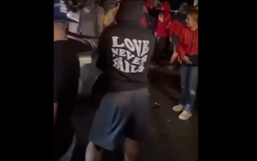 Sadly, one of the main perpetrators who repeatedly kicked the side of the woman's car was wearing a hoodie with a written message on the back that read, "Love Never Fails."
