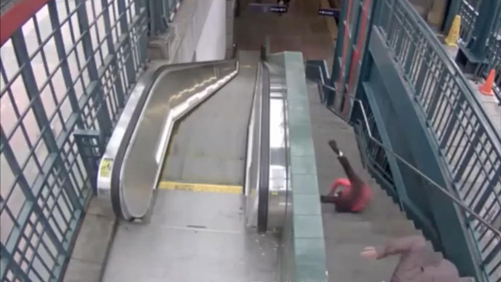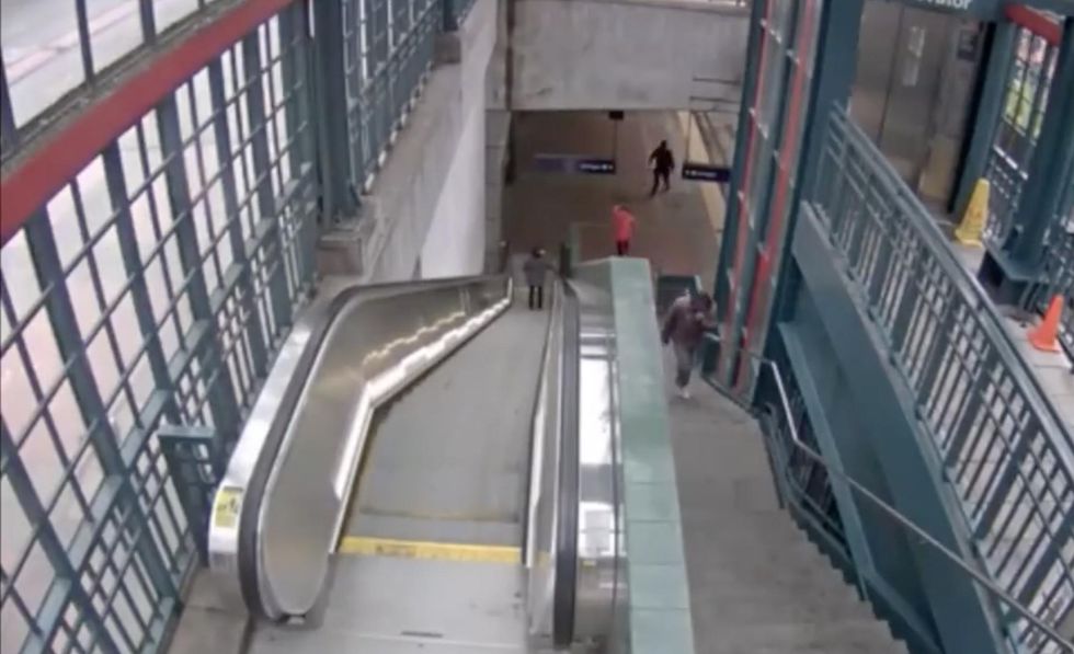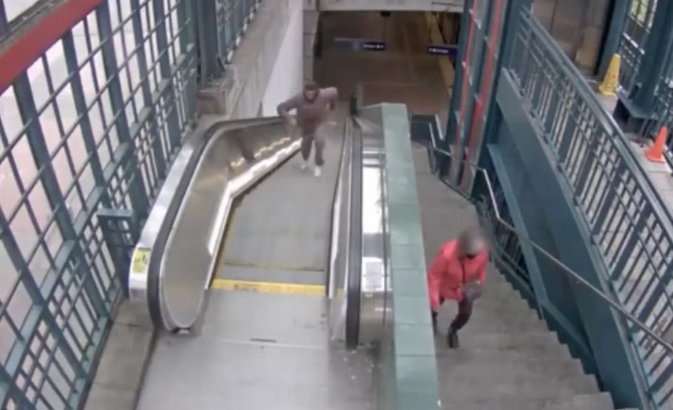 Surveillance video shows Jay running up the adjacent escalator and meeting her at the top: