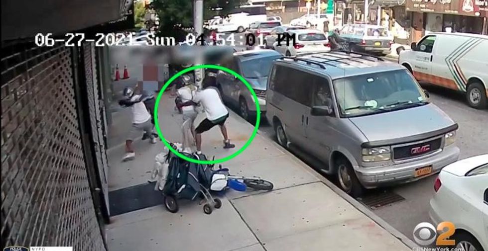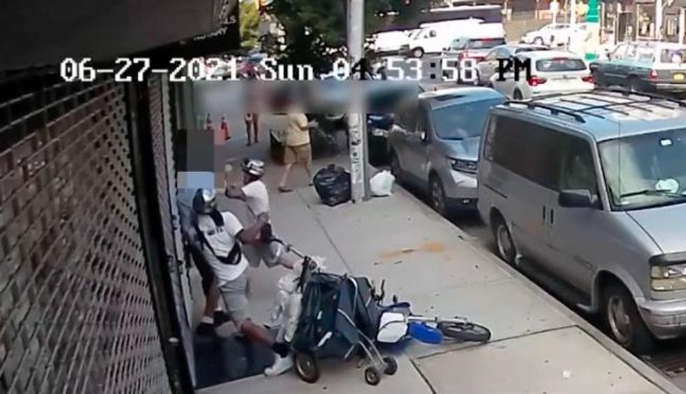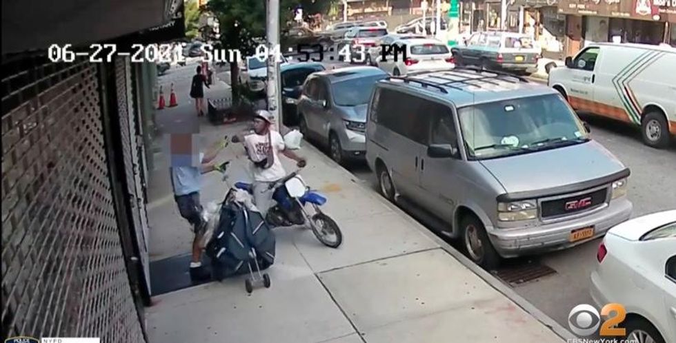 The video shows one of the suspects illegally riding his dirt bike on the sidewalk and coming at the postal carrier from behind. The worker swiped at him with his keys, WCBS said, and the suspect struck back.