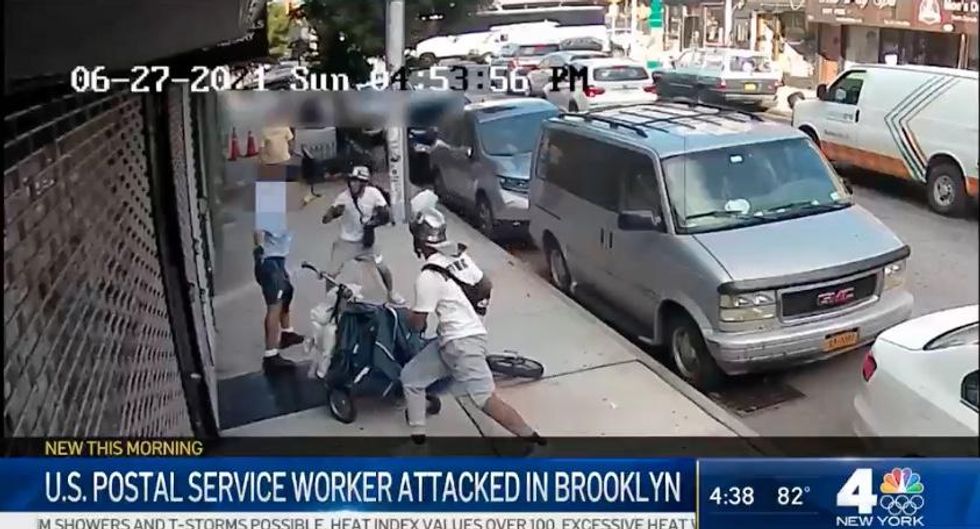 Two men beat a United States Postal Service worker in broad daylight this week as the man made his rounds on the sidewalks of Brooklyn, New York, WCBS-TV reported Wednesday night.
