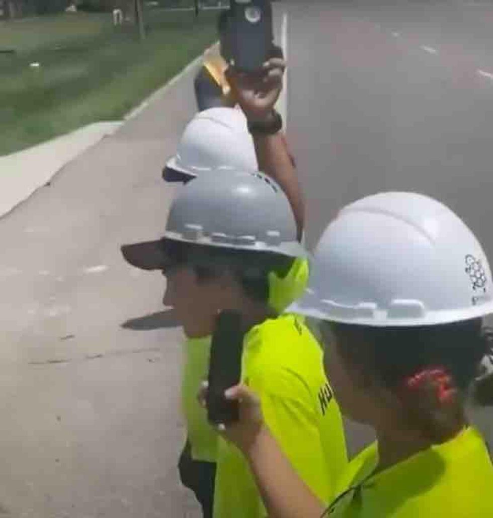 As the motorcade approached, a couple of utility workers watched facing forward —