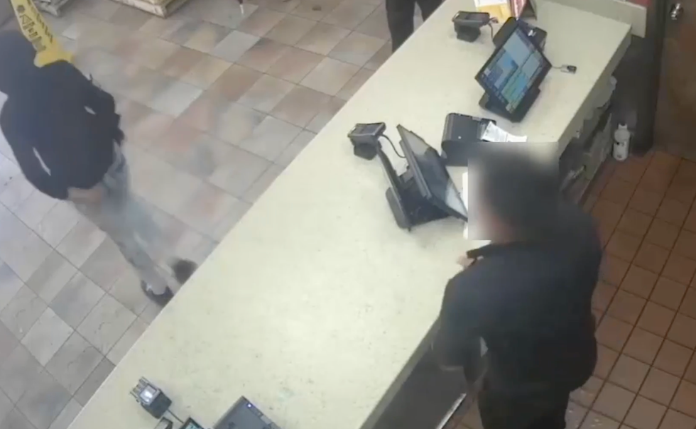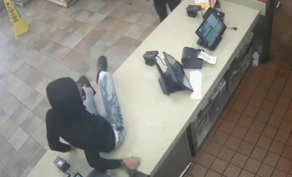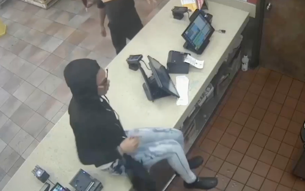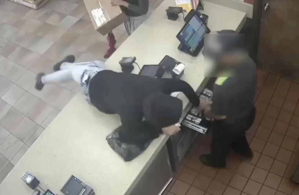The clip then cuts to the woman walking back to the counter, hopping back over it, and casually walking out of the restaurant.