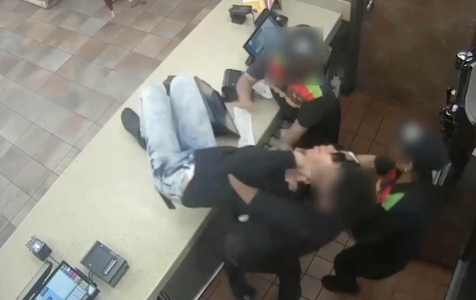 Video shows another employee rushing over and pulling the woman off the counter and heading to the back of the store. Newsweek said the woman was carried toward the kitchen.