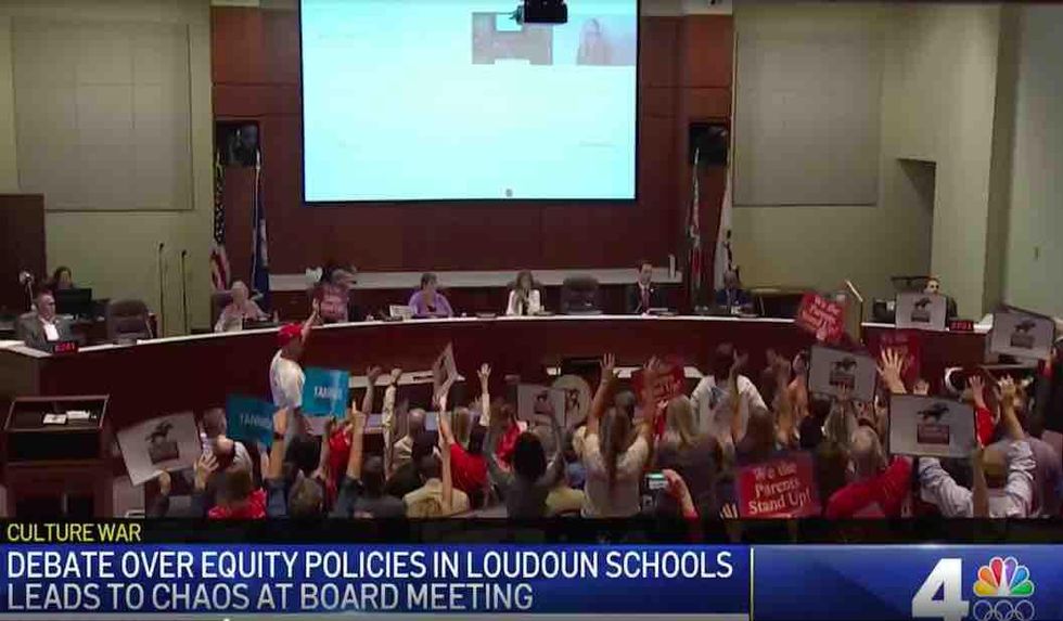 A huge crowd of parents at the meeting — furious over critical race theory and policies surrounding transgender students — held up signs saying "We the parents stand up" and "Education not indoctrination," the station said, adding that they also chanted and even sang the national anthem.