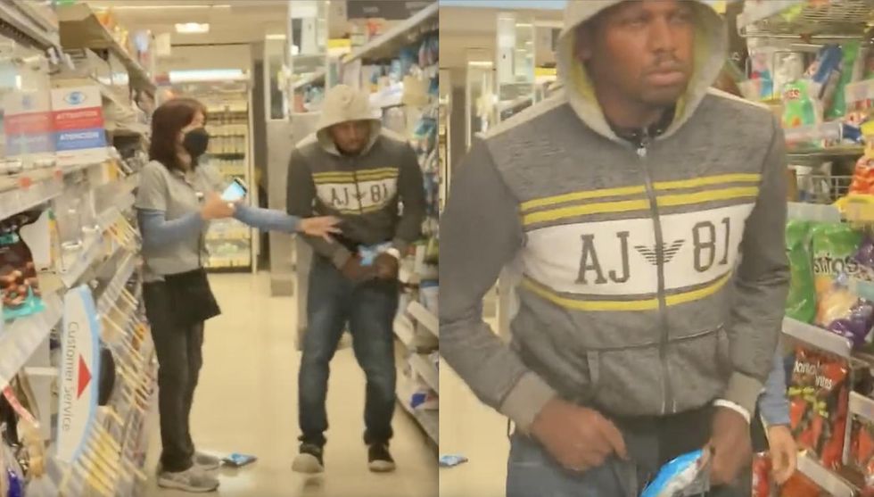 The shoplifter then brazenly reaches into the shelves and stuffs several items down his pants — and Mary calls him out for it, just inches from him.