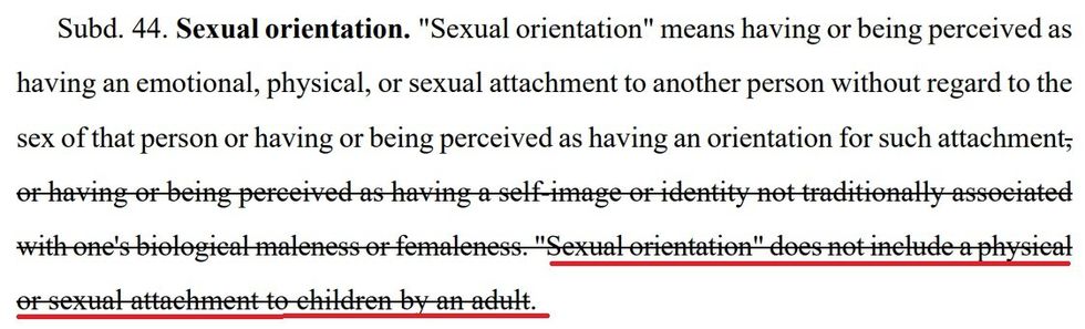 That language was never restored, and the final definition of sexual orientation included in version of the bill that Walz signed makes a vague association between sexual attraction and adulthood by employing terms like "men" and "women" but does not expressly preclude pedophilia.