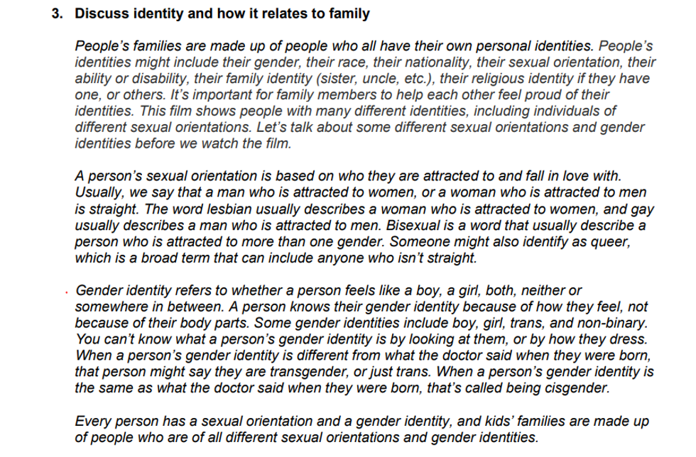 Under the "family" lesson plan, the children are to learn about gender identity and "how it relates to family."