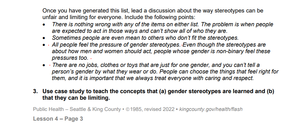 "Even though the stereotypes are about how men and women should act, people whose gender is non-binary feel these pressures too," the lesson plan declares.