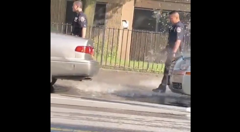 A second video shows a pair officers repeatedly getting water thrown and dumped on them — and the drenched cops simply walk away without reacting.