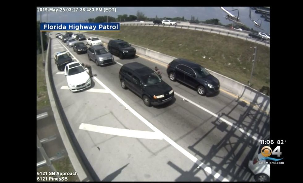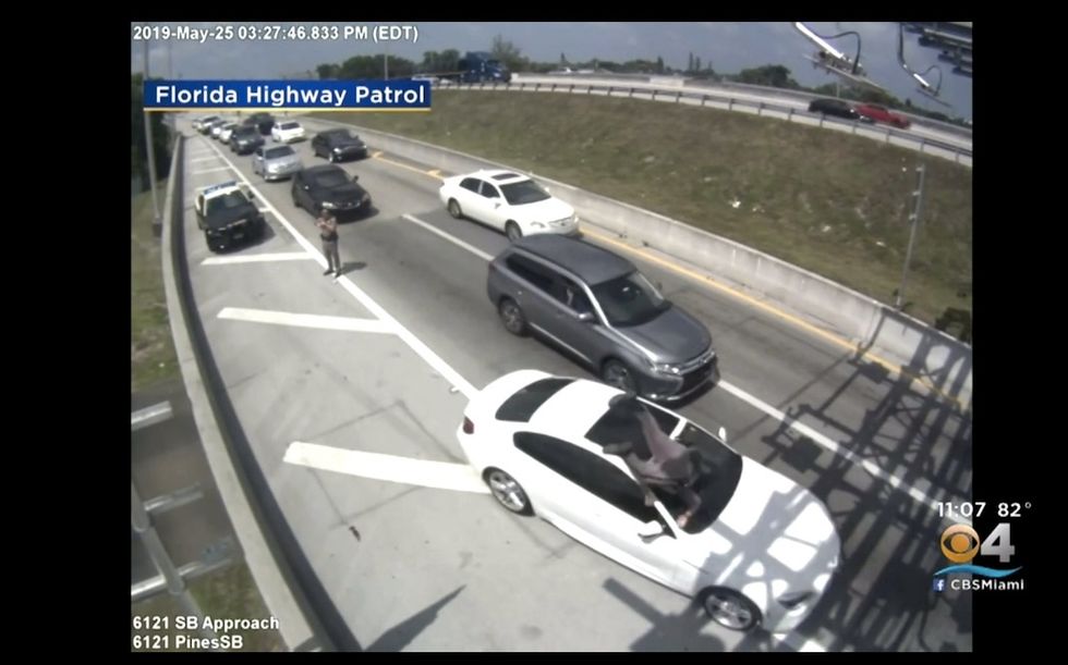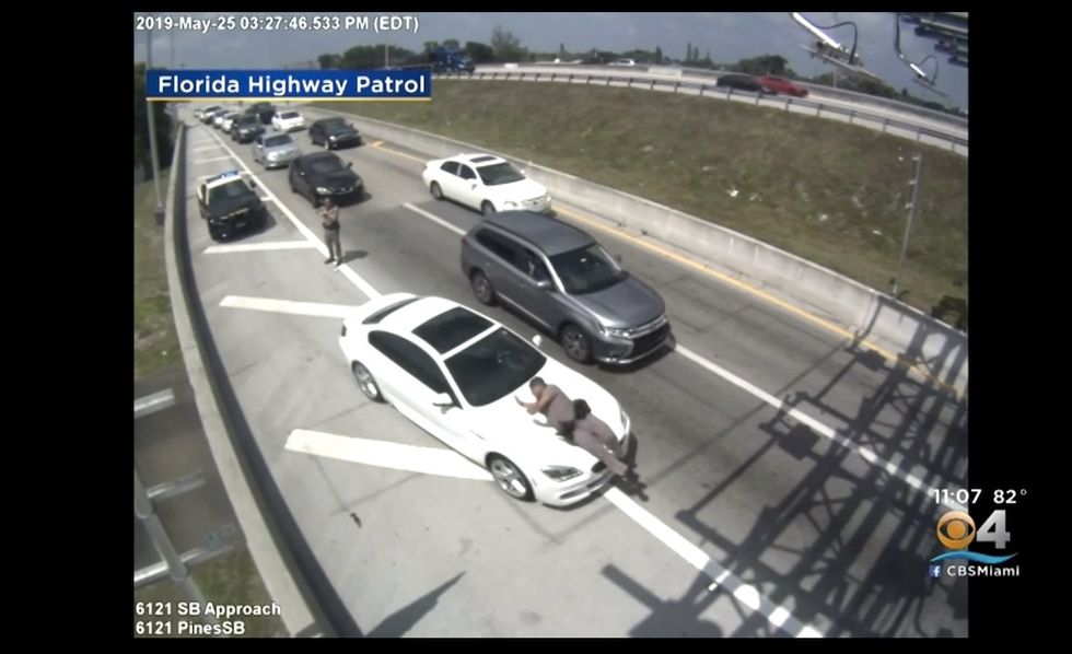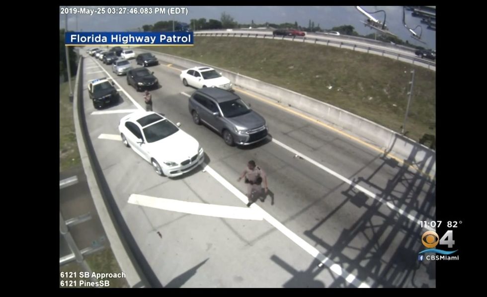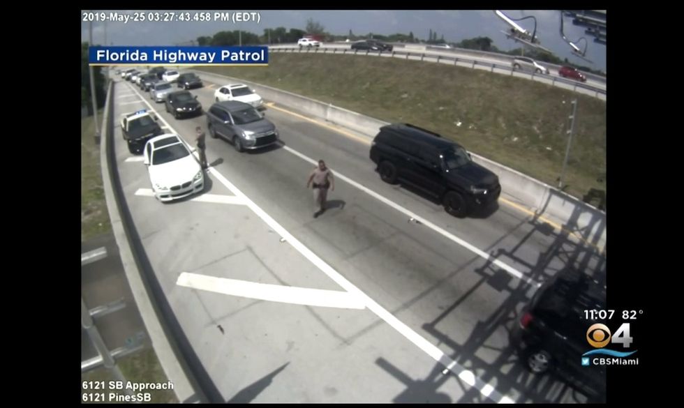 Trooper Arsenio Caballero is seen in the video speaking to a driver in a dark-colored SUV on a Florida Turnpike exit ramp in Hollywood on May 25, WFOR-TV reported.