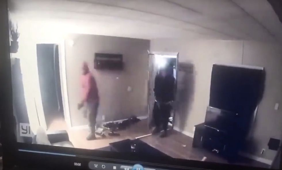 Video shows a sudden barrage of bullets directed at the foursome before they turn tail and run out the just-kicked in front door.