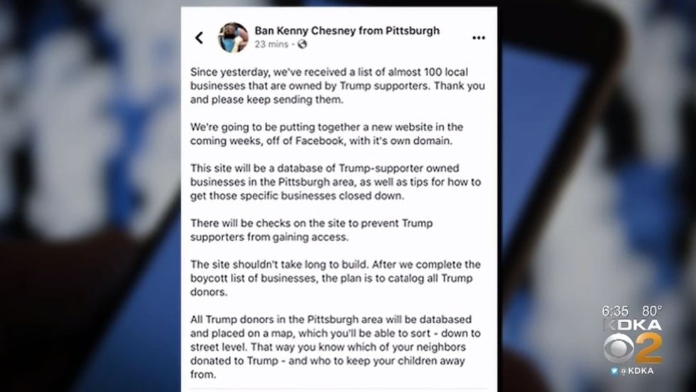 In Pittsburgh, for example, there's an apparent effort afoot to identify and boycott businesses owned by Trump supporters, KDKA-TV reported.