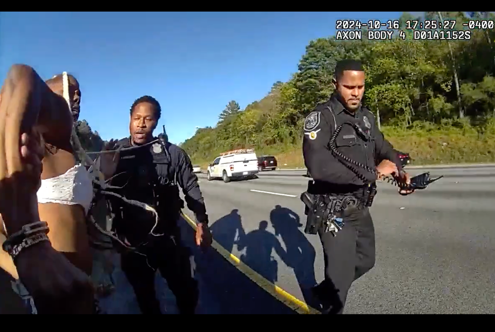 In a wild police video out of Georgia last week, cops are seen ramming a car that was driven by a female armed robbery suspect — and she actually tried to run away after the jaw-dropping crash on an interstate.