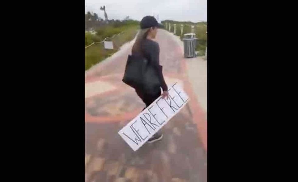 A woman holding a "We Are Free" sign while sitting on the sand Sunday in Miami Beach was dragged away by police who arrested and charged her with violating an emergency order, trespassing, and resisting an officer without violence, WTVJ-TV reported.