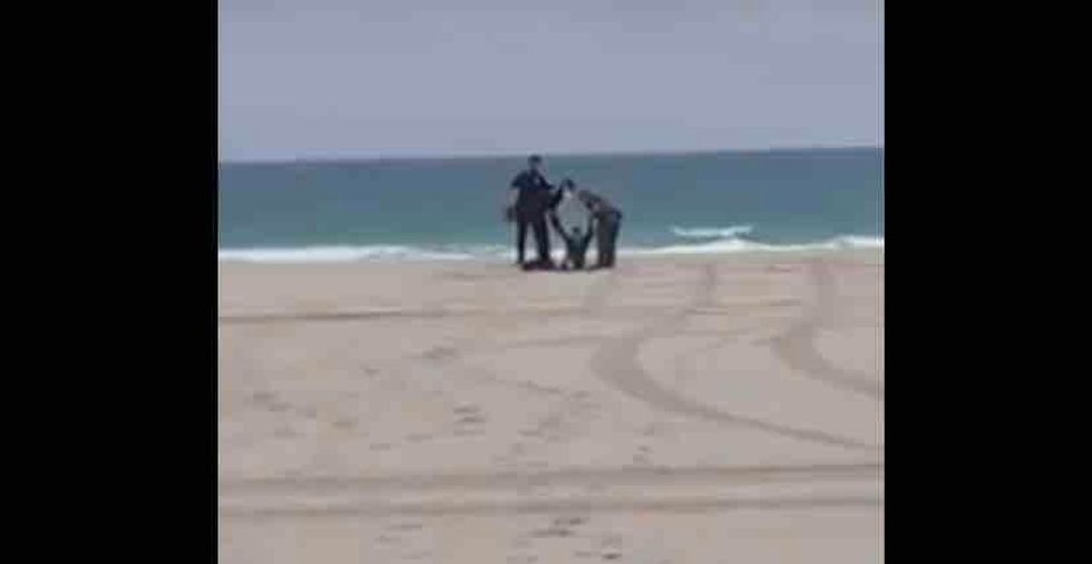 Then a trio of officers made their long walk from the sidewalk to the spot where Falkenstine was sitting on the sand:
