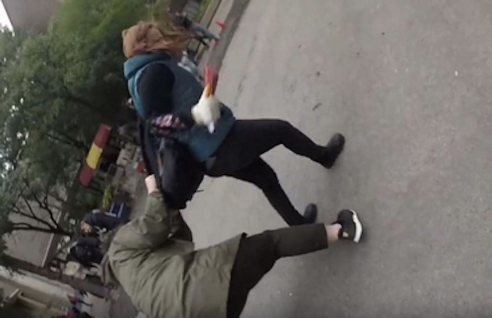 Skwarko is seen picking up a dolly that held the signs and throwing it in their direction. Skwarko reaches into Somers' backpack and smashes an object on the ground while pushing her.