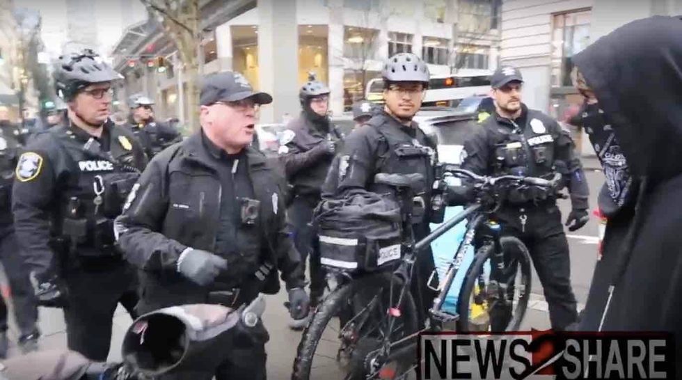 Now, most folks at this point would acquire some mental clarity and conclude that messing with cops in this way is a bad idea. But this is Antifa we're talking about, and given that they tend to get away with a quite a bit, the woman naturally ran at the police line again.