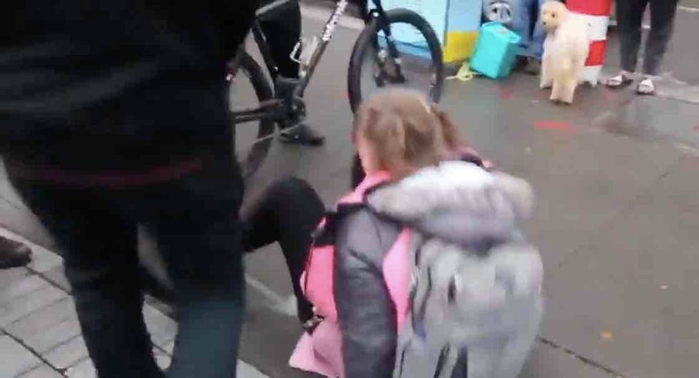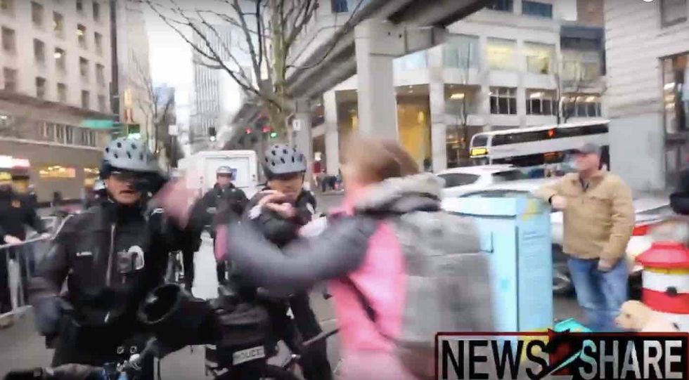At another point amid Antifa's antics, that same woman decked out in pink tried rushing the cops' bike line. Video shows her running at the officers and getting shoved backward.