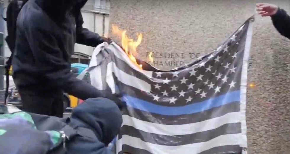 At one point the Antifa militants burned a thin blue line American flag while standing at the base of the statue of John Harte McGraw, Washington's second governor.