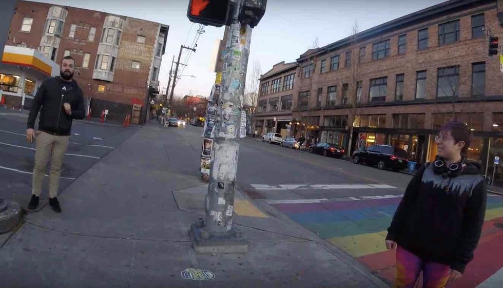 Well, a woman suddenly appeared with Wiersema on the corner and began cursing at him and repeatedly screaming at him — and he recorded most of the jaw-dropping interaction and posted it to YouTube Wednesday.