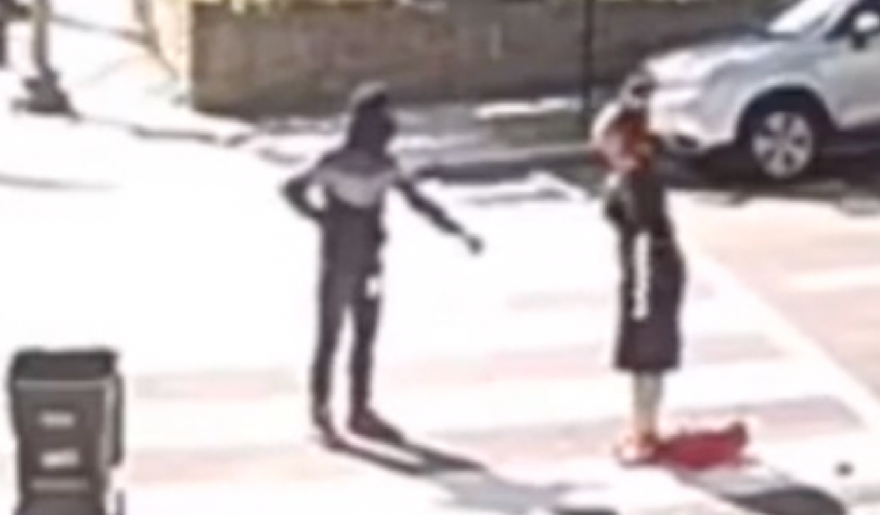 Soon the suspect backs up and begins to move away as Bond Gill claps her hands and appears to holler at the gunman. He then moves toward Bond Gill again, points at her, and even raises his gun at her, apparently pretending to shoot as she flinches.
