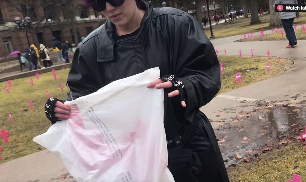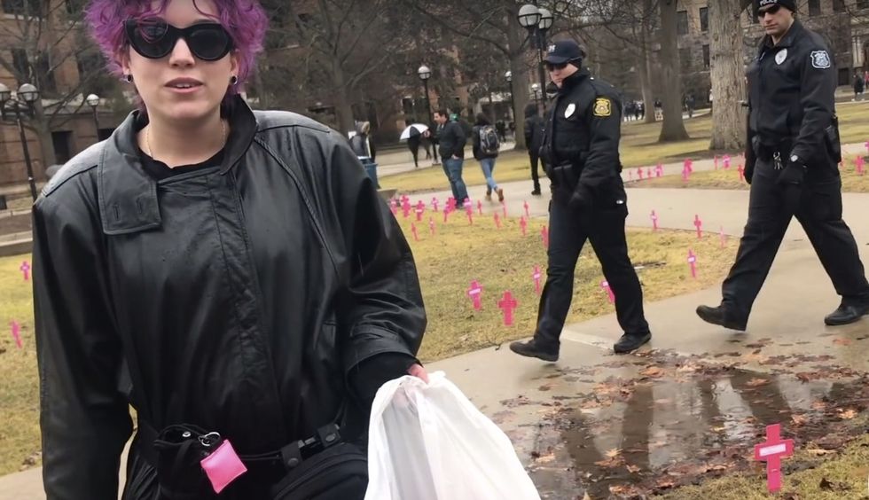 Throughout the day individuals continually pulled the crosses from the grass and placed them in trash bags, the group said. In the afternoon, Kaylena Wiederhold, Michigan Regional Coordinator of Students for Life, confronted the individuals — and one exchange was caught on camera.