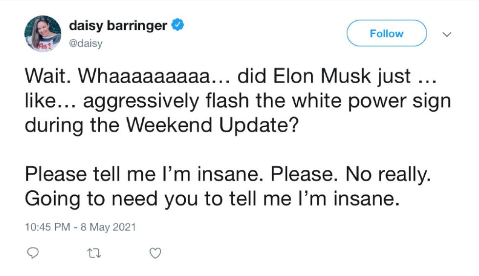 She wrote, "Wait. Whaaaaaaaaa… did Elon Musk just … like… aggressively flash the white power sign during the Weekend Update? Please tell me I'm insane. Please. No really. Going to need you to tell me I'm insane."