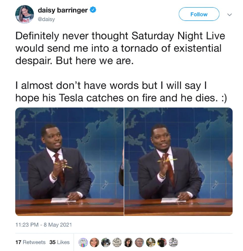 She later added, "Definitely never thought Saturday Night Live would send me into a tornado of existential despair. But here we are. I almost don't have words but I will say I hope his Tesla catches on fire and he dies."