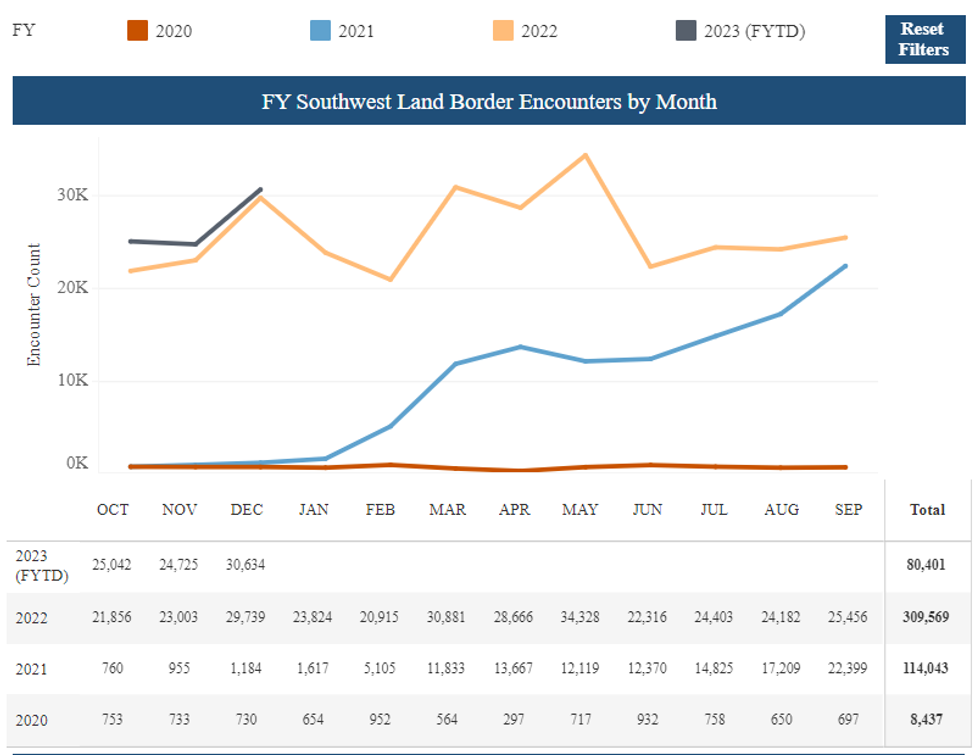 Extrapolating on the encounters of the first fiscal quarter of 2023, current trends would result in approximately 320,000 border encounters by the end of the fiscal year.