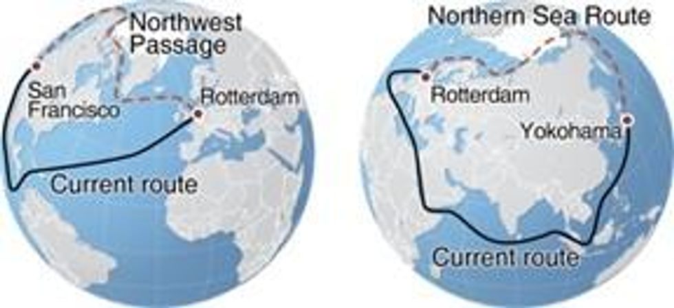 The thawing of the Arctic will connect North America with Europe’s largest port, Rotterdam, via the Northwest Passage. It will also connect Rotterdam to Yokohama via the Northern Sea Route.