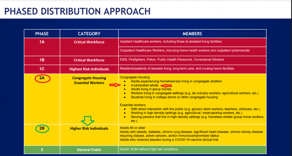But phase 2A is where things go off the rails. Placed before all high-risk individuals with serious underlying conditions, including seniors with underlying conditions, are "congregate housing" dwellers and other "essential workers." We can debate the merits of placing this general category ahead of high-risk individuals in phase 2B, but notice the one group that is included before them in 2A? "Incarcerated adults."