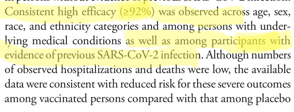 The updated version from January 29 separated the original sentence into two sentences and reads as follows: "Consistent high efficacy (≥92%) was observed across age, sex, race, and ethnicity categories and among persons with underlying medical conditions. Efficacy was similarly high in a secondary analysis including participants both with or without evidence of previous SARS-CoV-2 infection."