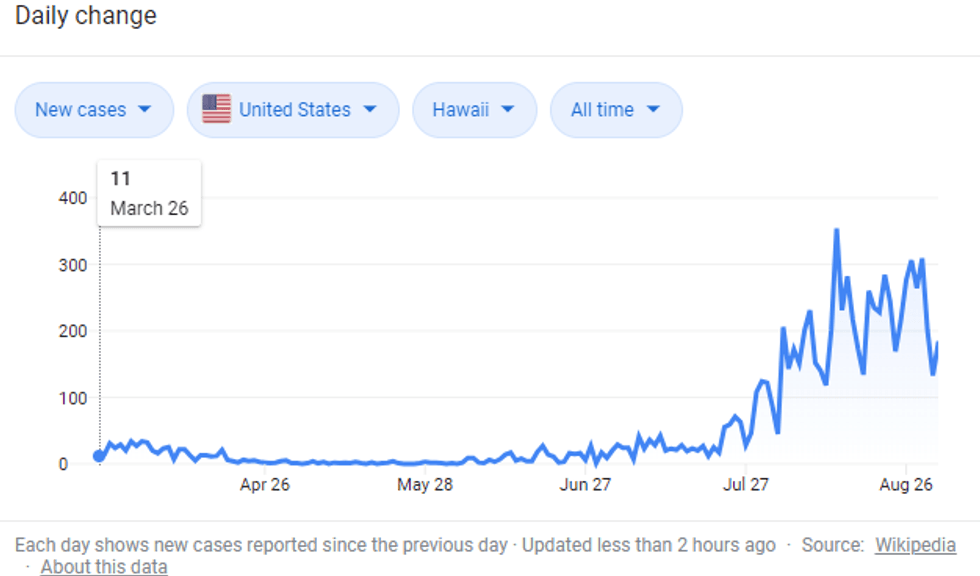 As you can see, Hawaii's daily case count grew more than tenfold in July and August. All along, state officials thought they were steering this ship cleanly throughout the spring and that their draconian efforts avoided the spread of the virus. Instead, it has become clear that the virus simply arrives at southern latitudes several months later and spreads for six to eight weeks, as it does everywhere else.