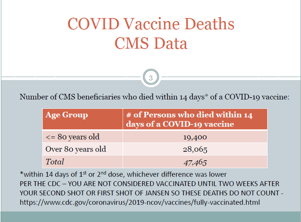 As part of Renz's PowerPoint that he is using in his lawsuits, he quarried data from CMS that nets 47,465 deaths within 14 days of either the first or second shot.