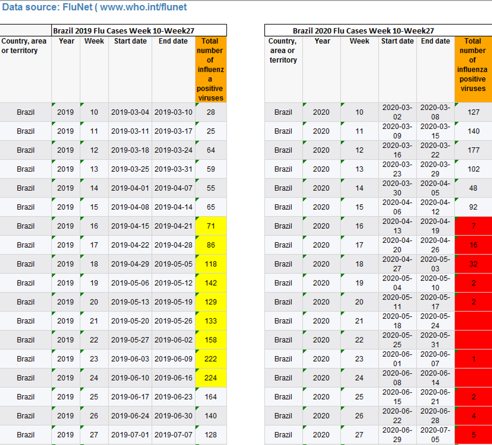In Brazil, which notoriously eschewed lockdowns at the national level, a policy that President Jair Bolsonaro has been roundly criticized for, there was the same abrupt end to the flu season. A search of the WHO's influenza surveillance country database shows that Southern Hemisphere countries usually see an increase in flu cases in weeks 10-12 and then a continuous climb through July. In Brazil, as in all other countries (regardless of mitigation policies), the numbers dropped off and went backward in April relative to last year's numbers, which accelerated for several months thereafter.