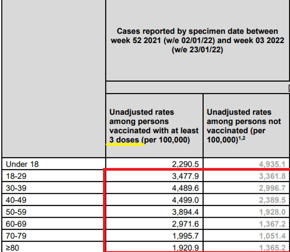 Here is the raw data from table 13 showing the negative efficacy even of the triple-vaxxed relative to the unvaccinated in the adult cohorts: