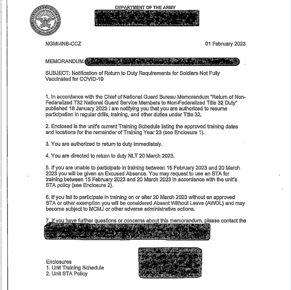 Indeed, it is true that the January 18 memorandum referenced by this letter seemed to indicate that they can be ordered back to duty. “All currently serving nonfederalized Army National Guard and Air National Guard members who are not fully vaccinated for COVID-19, but are otherwise qualified and eligible are no longer prohibited from, and may be directed to resume participation in drills, training and/or other duty conducted under Title 32,” states the memorandum from National Guard Bureau Chief Daniel Hokanson. (Emphasis added.)